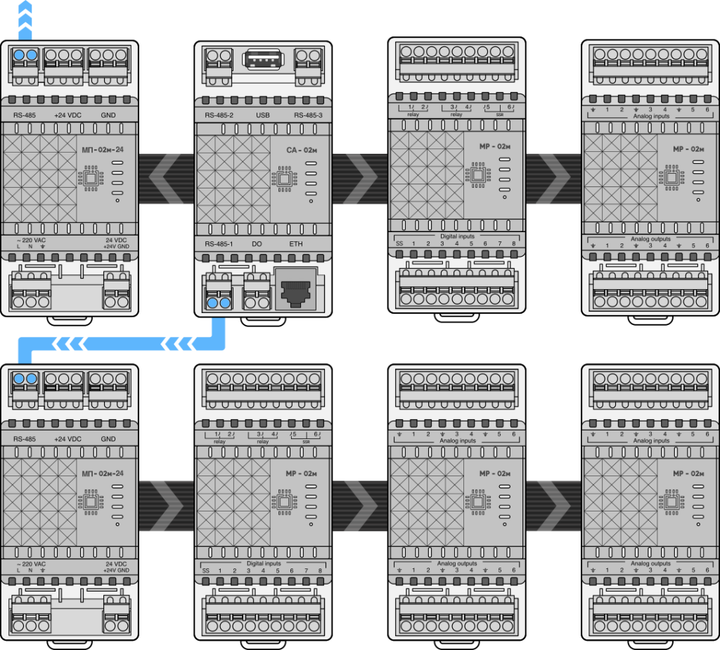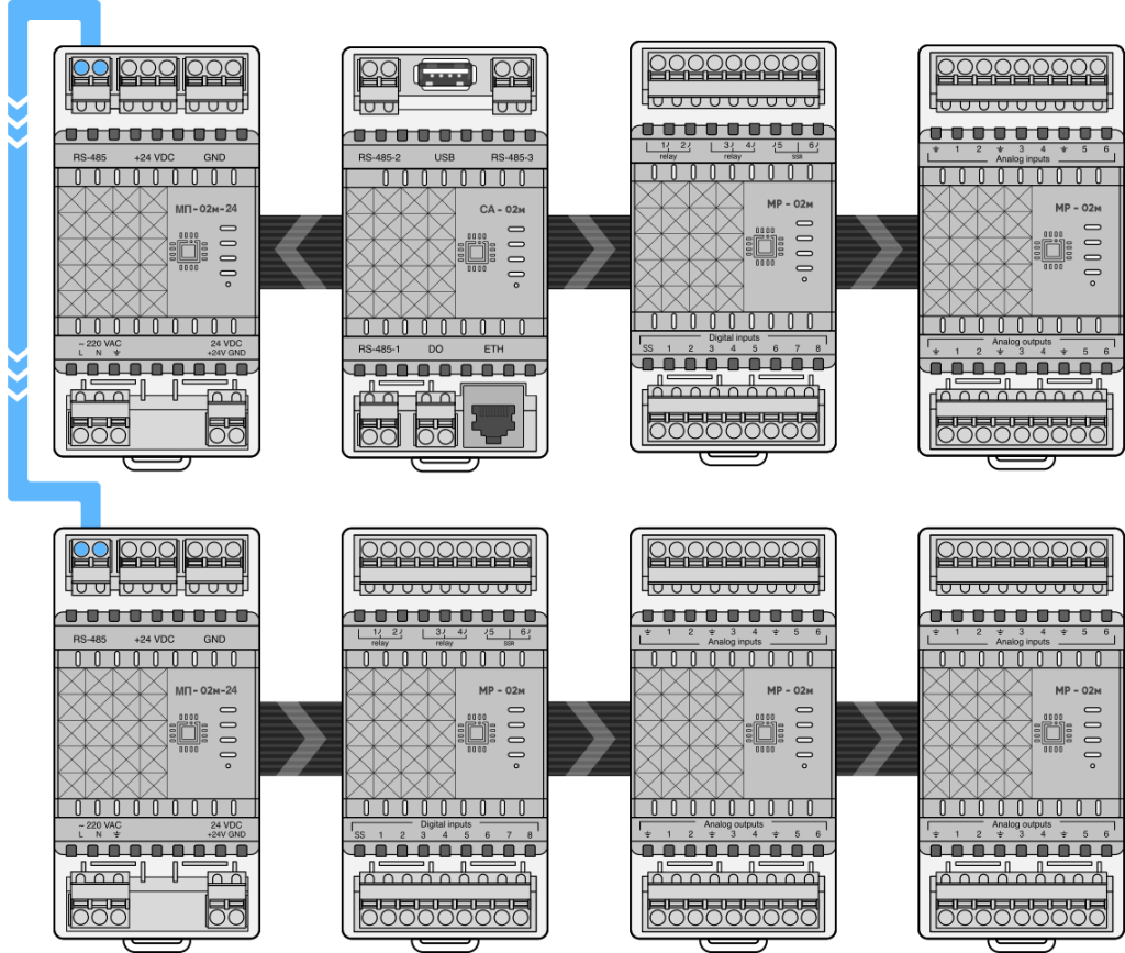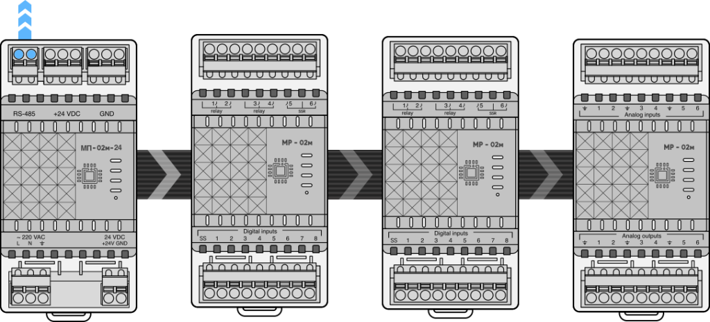 - Напряжение питания 24 В постоянного тока через торцевой разъем